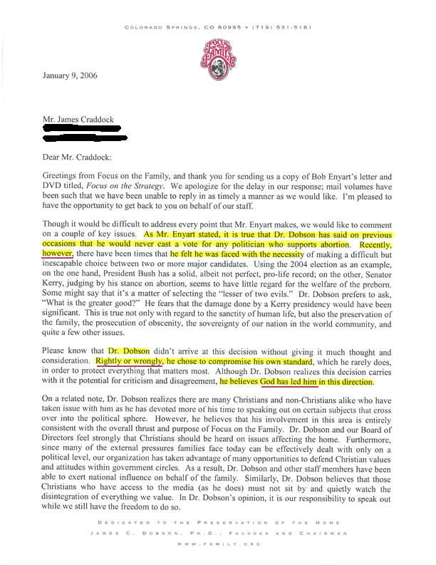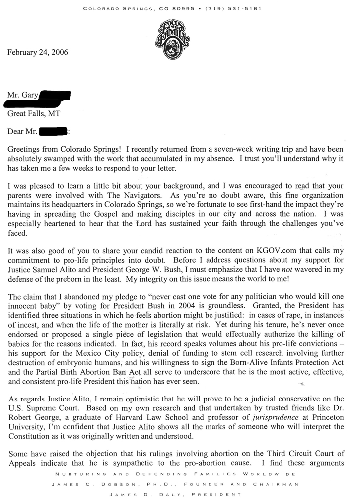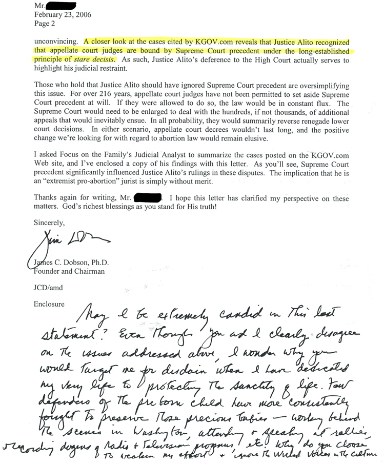 Focus on the Family has now explicitly admitted their commitment to legal positivism in their February 2006 Citizen Magazine. Dr. Dobson actually approves of a ruling to keep partial birth abortion legal on process grounds. His justification is that the legal process takes precedence over Do Not Murder. The Focus article, Alito’s Abortion Rulings, was written by Bruce Hausknecht, Dobson’s Judicial Analyst (referenced in Dr. Dobson's personal letter below), who had attended Bob Enyart’s live presentation there of Focus on the Strategy: “New Jersey enacted a statute prohibiting partial-birth abortion, in which a baby is partially delivered feet-first and its brain matter removed… Alito joined his other panel colleagues in following the Supreme Court precedent, overturning the New Jersey statute [keeping PBA legal]. Once again, Alito made clear in a concurring opinion [2000] that the Stenberg decision controlled the result in the New Jersey situation. … Does the fact that Alito voted for a pro-abortion position in three out of the four cases indicate that he endorses a legal right to abortion on demand? Hardly. …an appellate judge… is to follow the statutes and the Constitution and apply Supreme Court precedent… Thus Alito faithfully and dutifully performed in each of these cases, reflecting his judicial restraint and faithfulness to the true role of judges.” -Bruce Hausknecht is Focus on the Family’s judicial analyst. |
